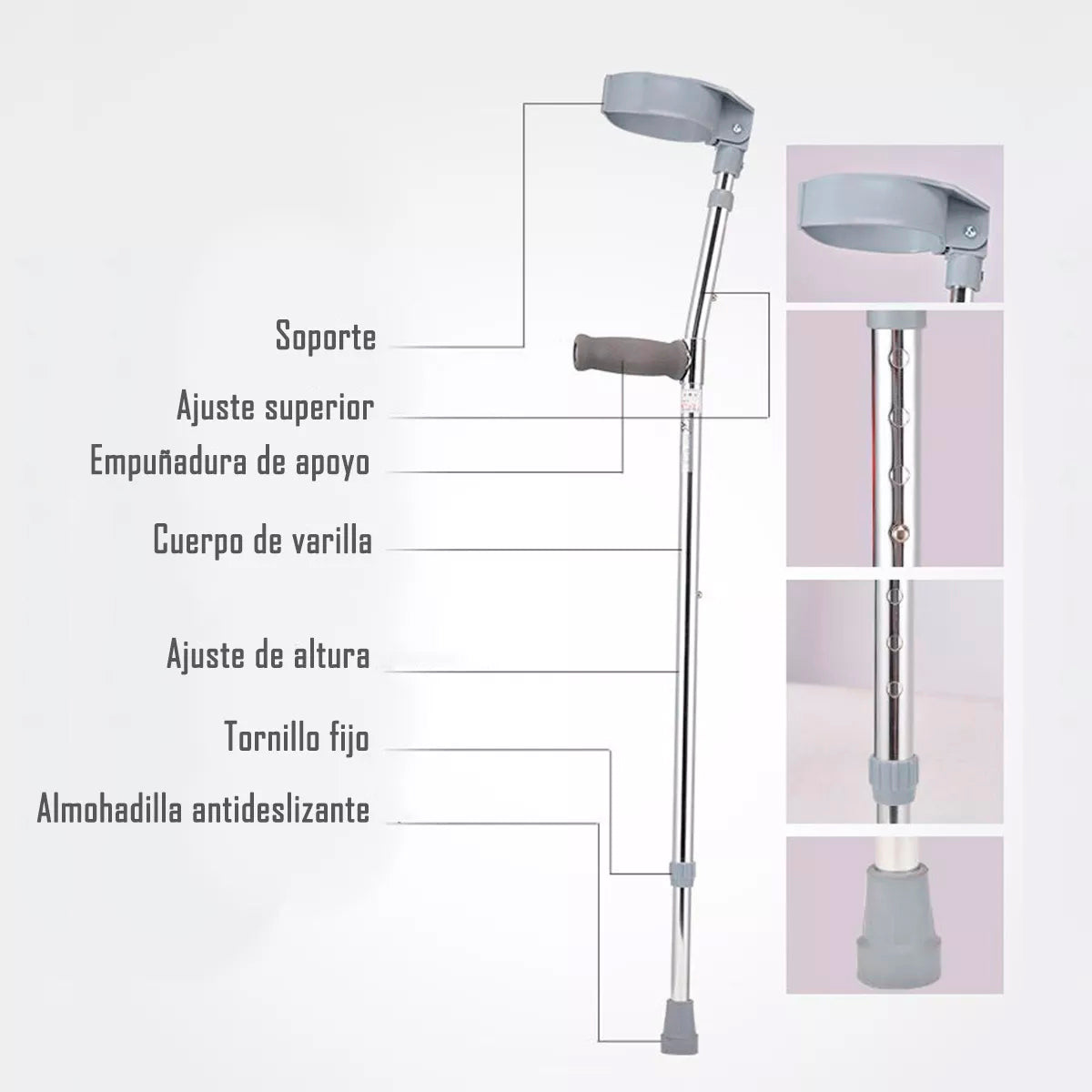 Bastón con codera canadiense, proporciona una experiencia cómoda y segura, las muletas de antebrazo eliminan la fatiga y el dolor causado por las muletas estándar mientras te permiten la movilidad necesaria cuando gestionas una discapacidad o recuperas de una lesión o cirugía. El agarre ergonómico y de apoyo está contorneado para adaptarse a la mano, reduciendo la fatiga de la mano y la muñeca y asegurando un posicionamiento adecuado para una movilidad segura durante cualquier actividad.