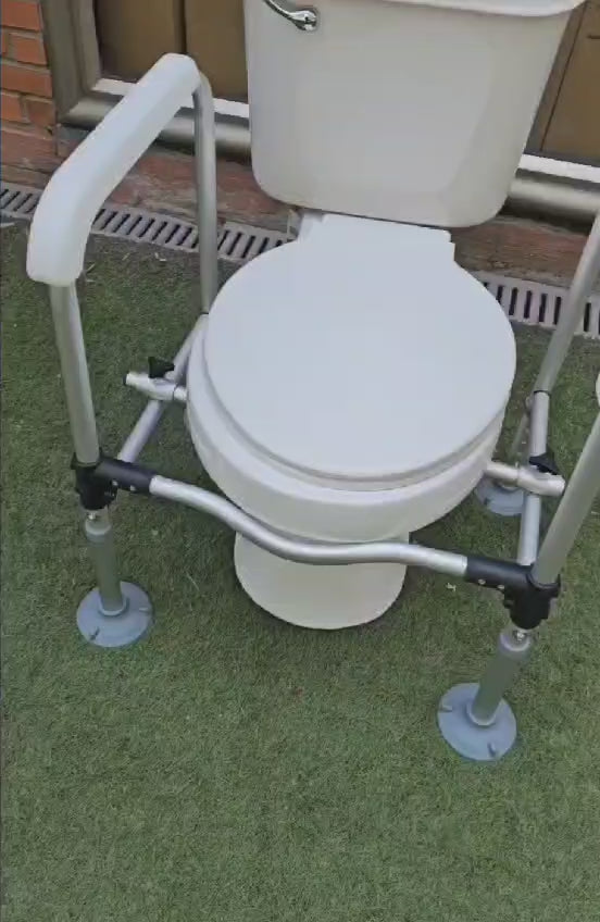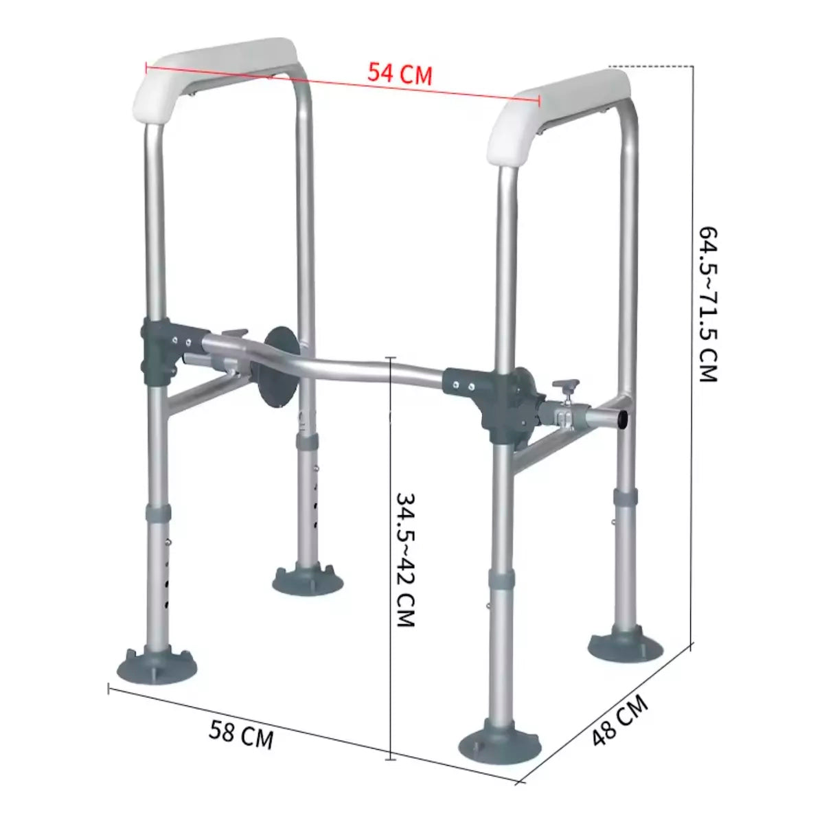 La barra de seguridad para WC Cuenta con una estructura que se adapta a cualquier taza de baño permitiendo al usuario un apoyo para sentarse y levantarse más cómoda y segura. Posee altura regulable adaptándose así a las necesidades de espacio. Posee apoyabrazos acolchados. Tope de goma antideslizantes con fijación de succión para mayor seguridad.
