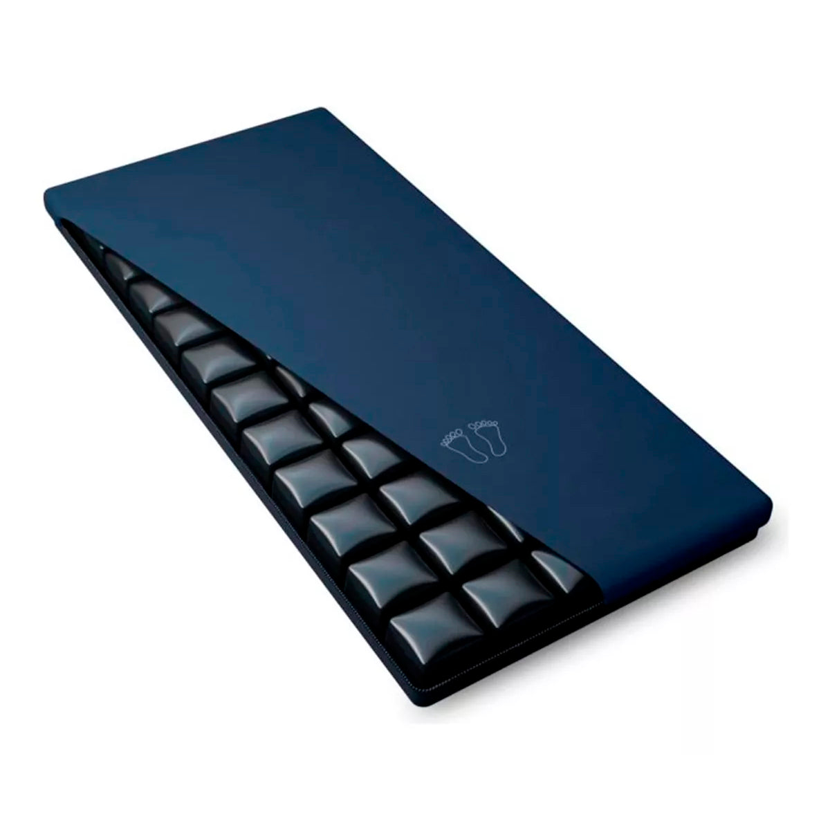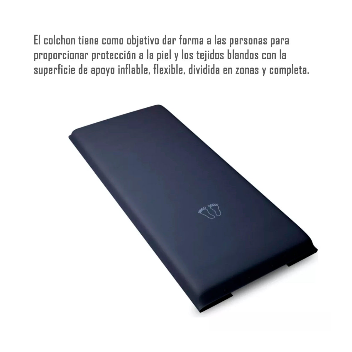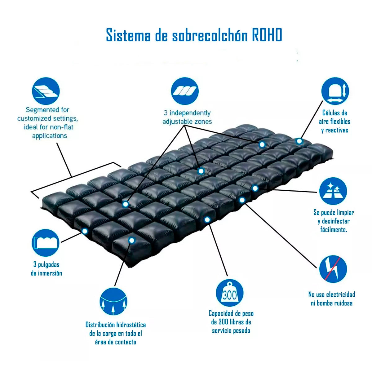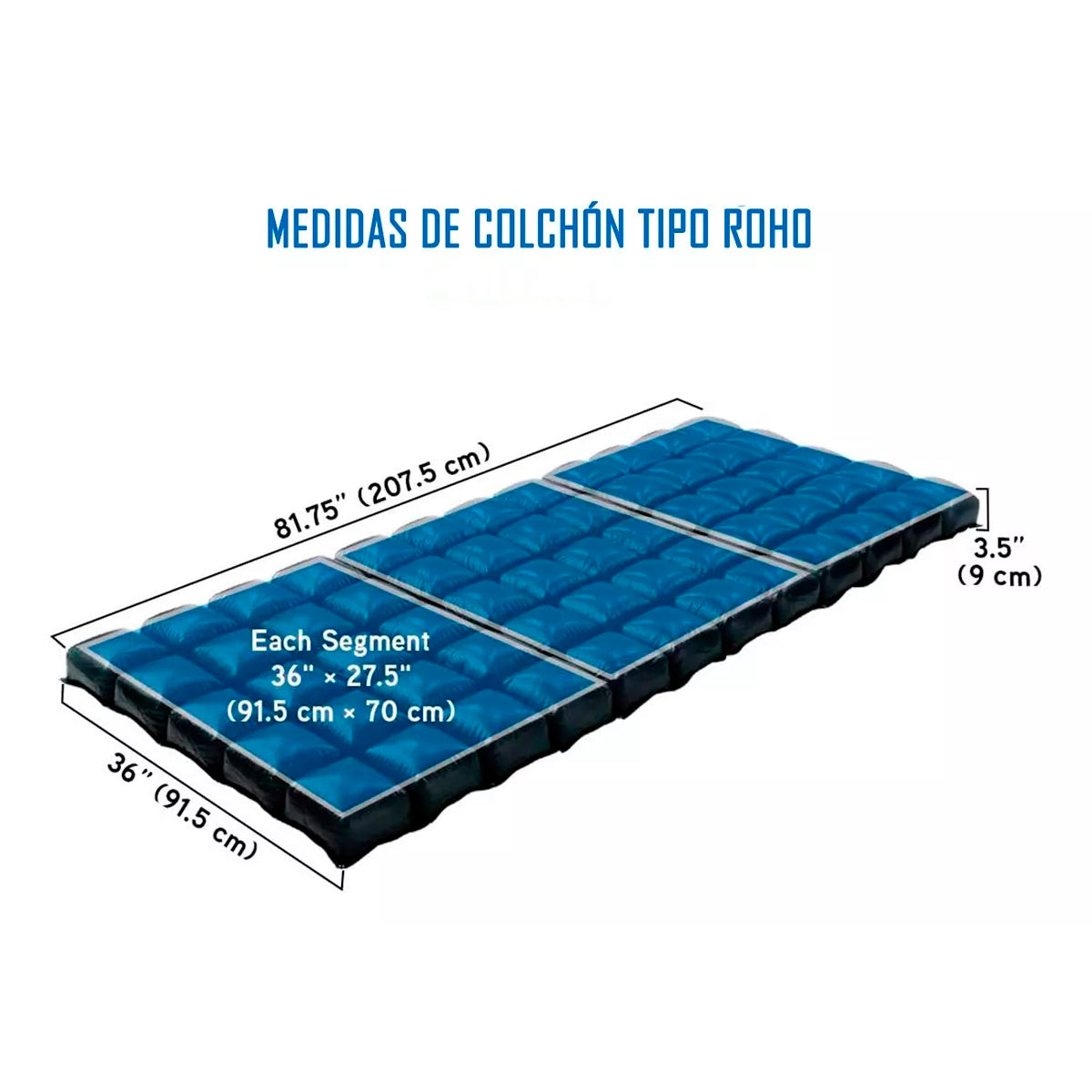 Colchón Antiescaras de Flotación Seca, de Inflado Manual con Bombín, de 3 Secciones independientes que se unen mediante broches, Celdas de Aire de 12 cms de alto que distribuyen la presión de manera uniforme.