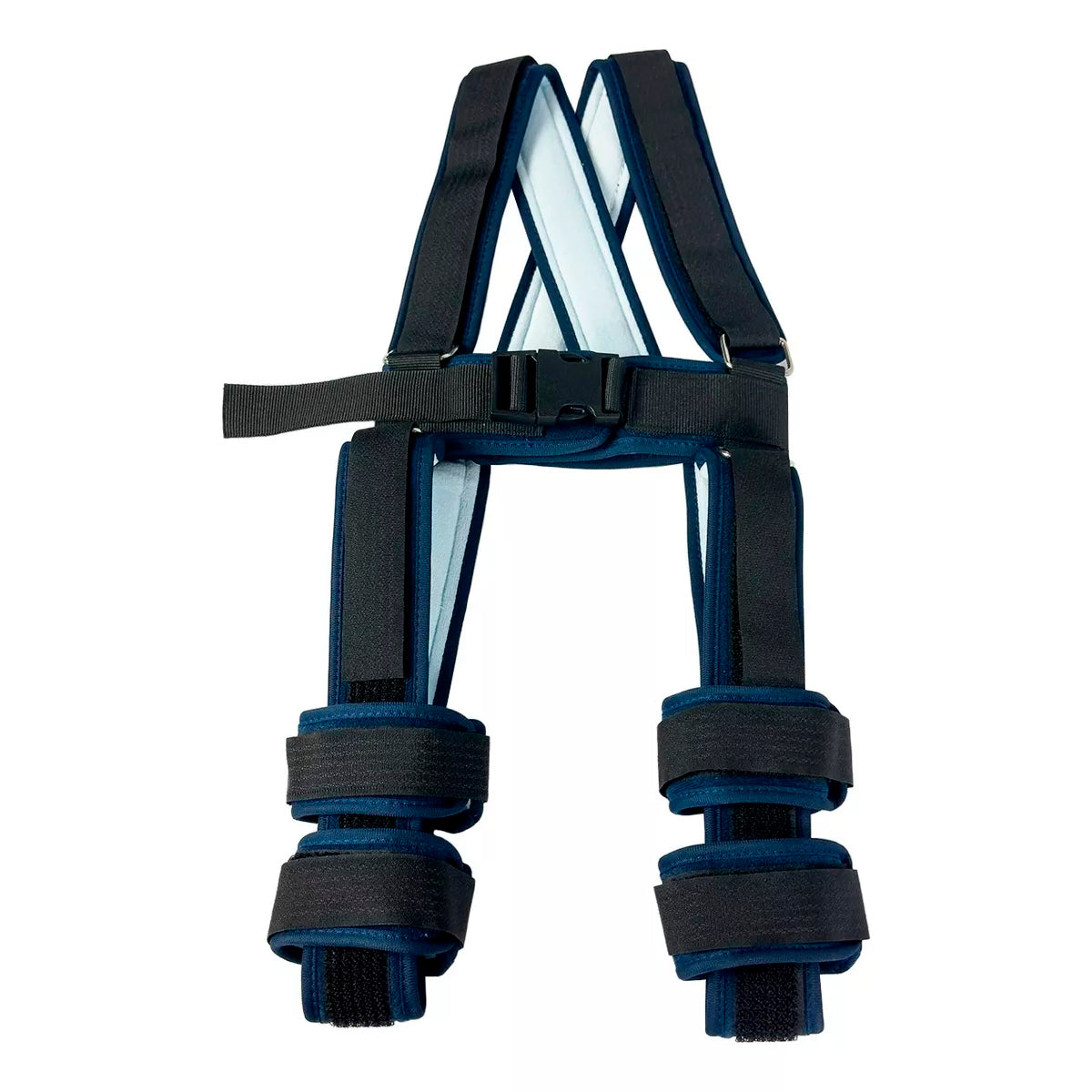 La correa tiene como objetivo posicionar la cadera en flexión, abducción y rotación externa, además, en la zona del pie cuenta con un estribo para dar firmeza.