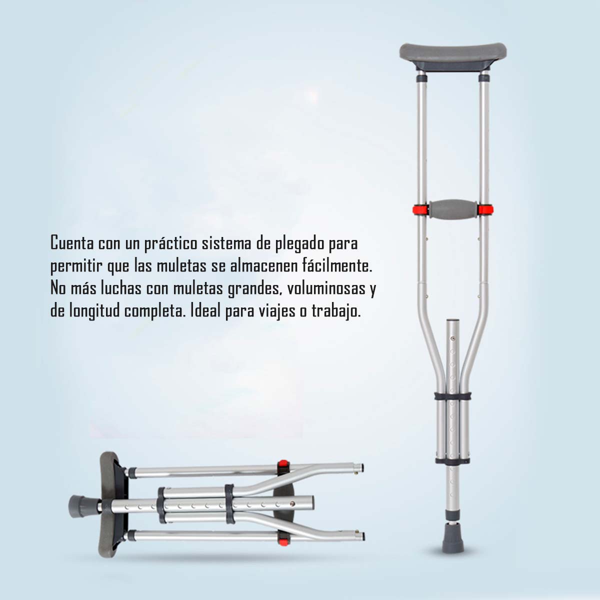 Muletas plegables, Cuenta con un práctico sistema de plegado para permitir que las muletas se almacenen fácilmente. No más luchas con muletas grandes, voluminosas y de longitud completa. Ideal para viajes o trabajo. El tamaño de las muletas se puede ajustar desde 97cm a 156cm y hay 16 ajustadores en total. Permite que cada usuario se ajuste con precisión a la altura más cómoda.