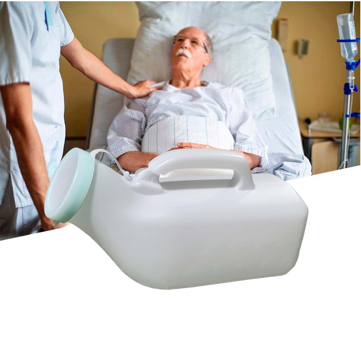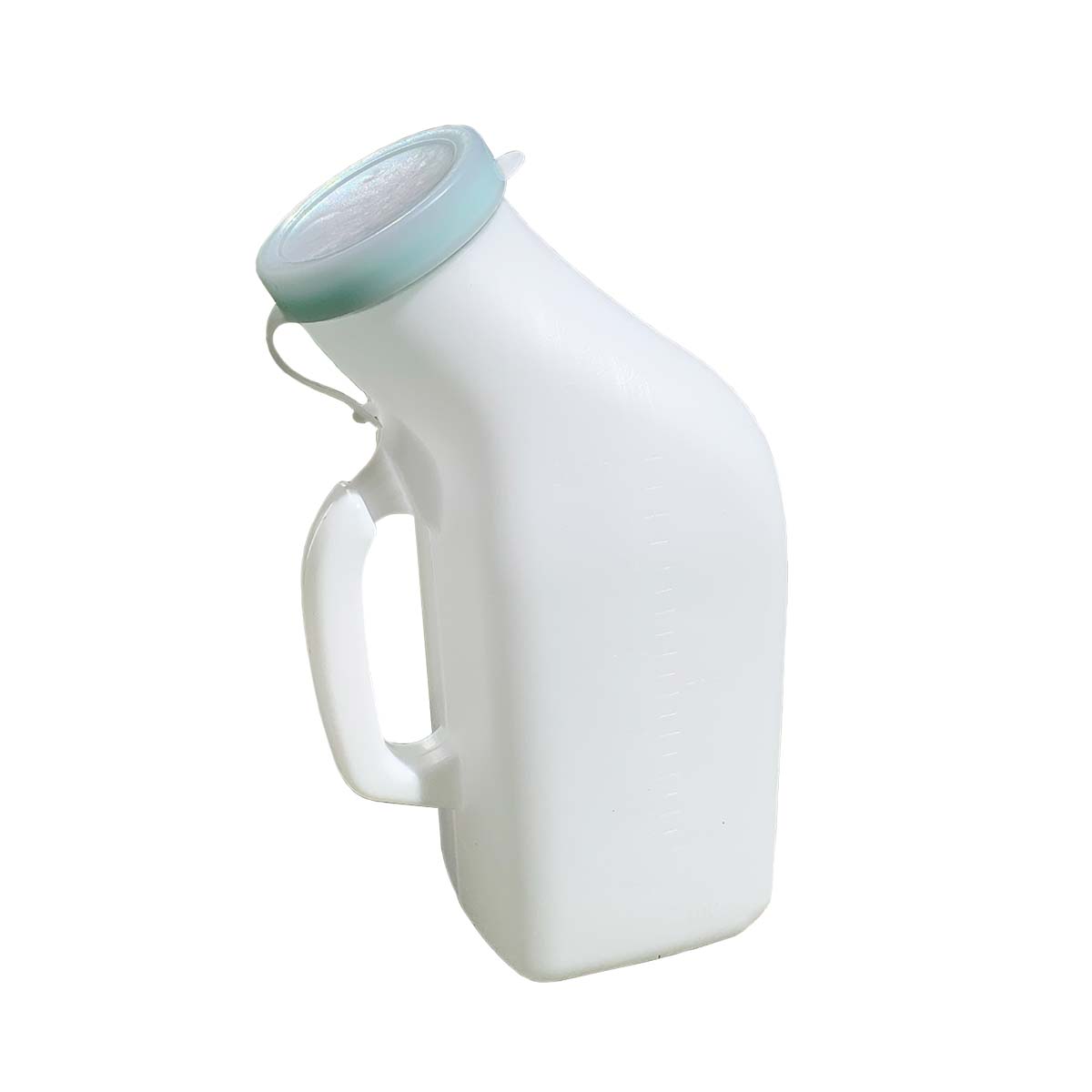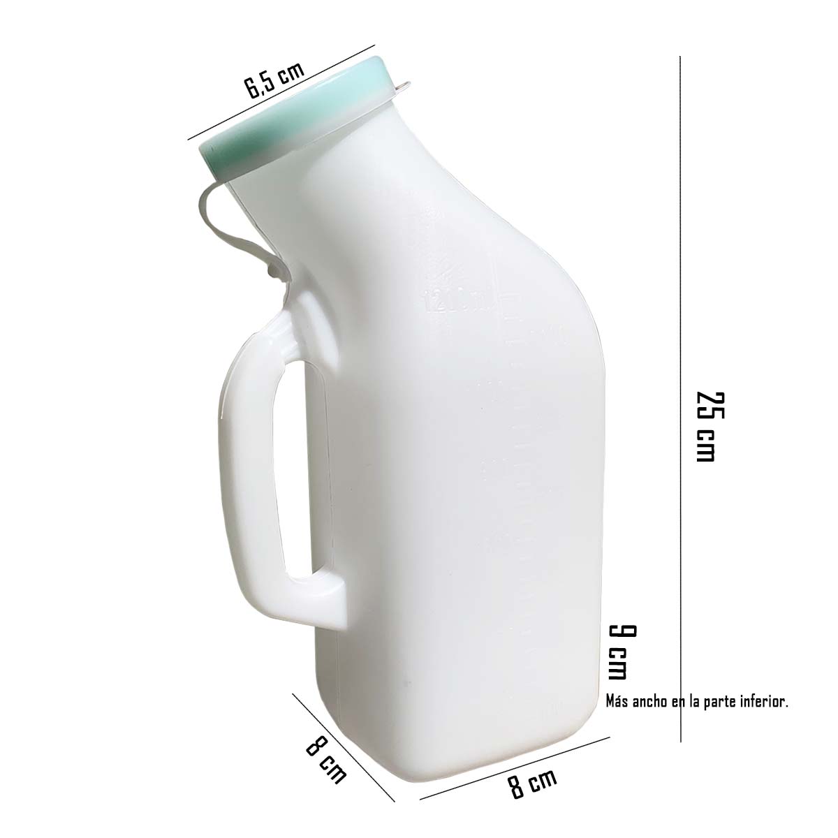 Urinario Masculino con tapa, Diseño exclusivo para pacientes con movilidad reducida o en proceso de recuperación post – operatoria. Tipo de Material Plástico Resistente, con capacidad de 1200 ML.