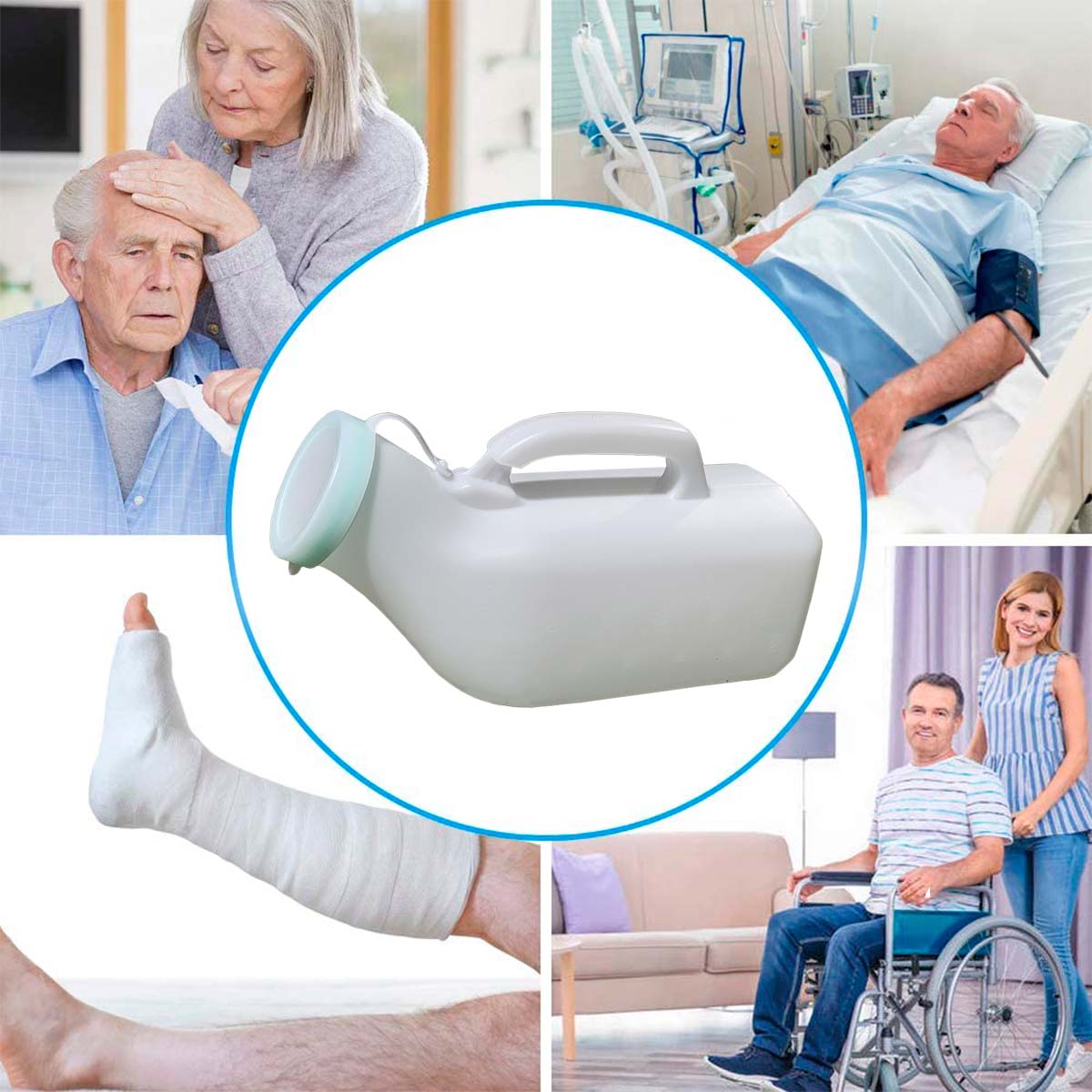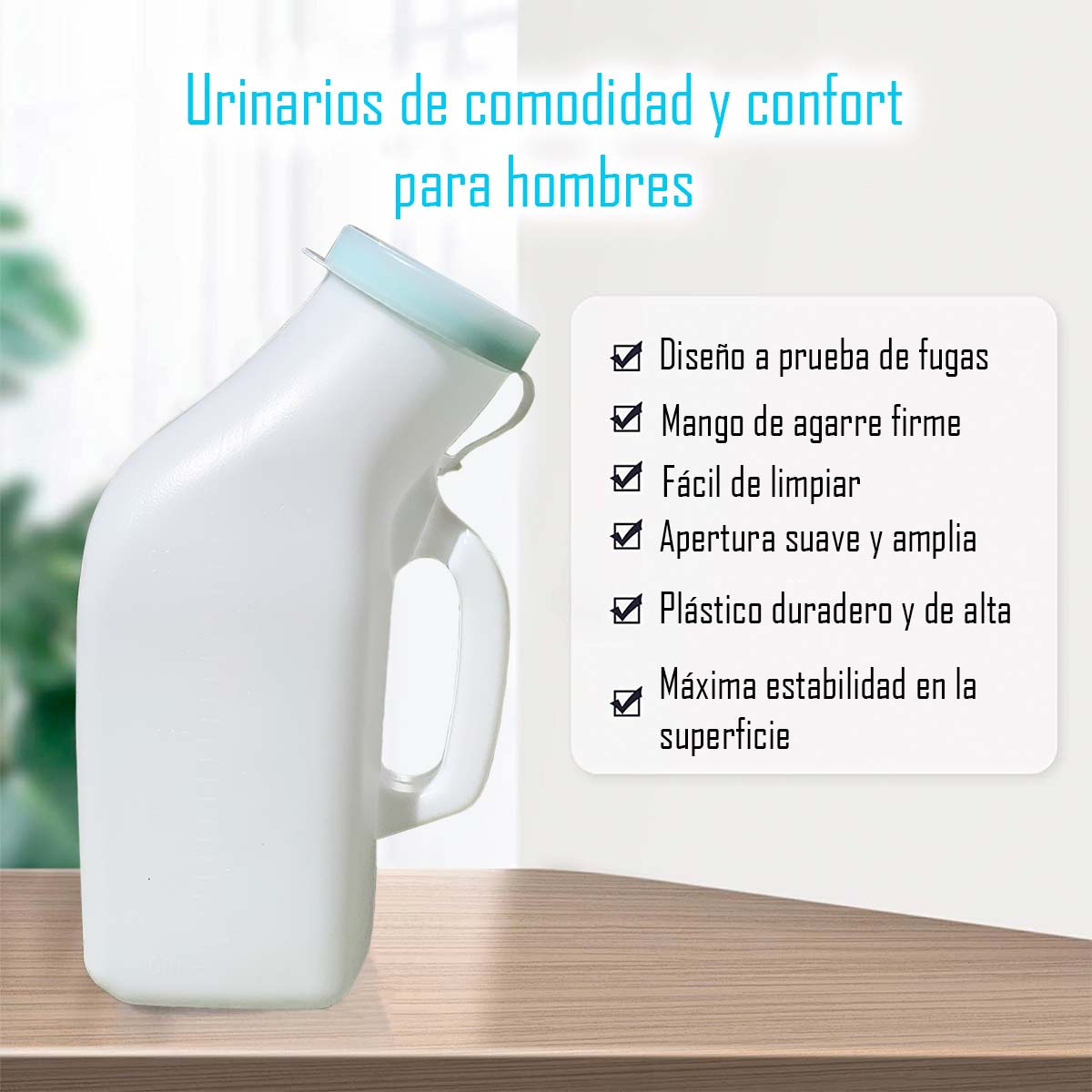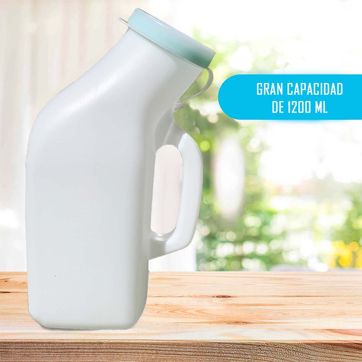 Urinario Masculino con tapa, Diseño exclusivo para pacientes con movilidad reducida o en proceso de recuperación post – operatoria. Tipo de Material Plástico Resistente, con capacidad de 1200 ML.
