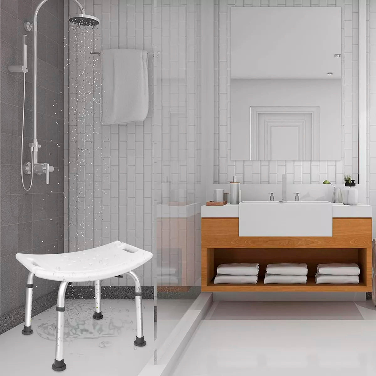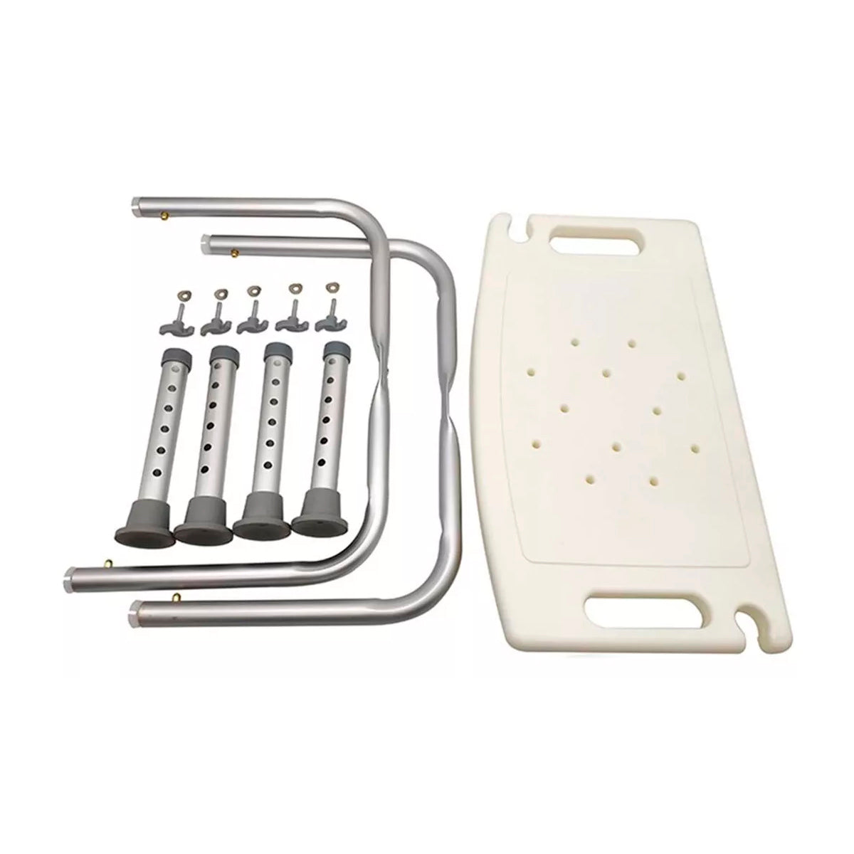 Piso de ducha para baño de aluminio ultra ligero de alta resistencia con altura ajustable y asiento curvo ergonómico, especialmente diseñado para entregar la mayor seguridad y comodidad en el baño.