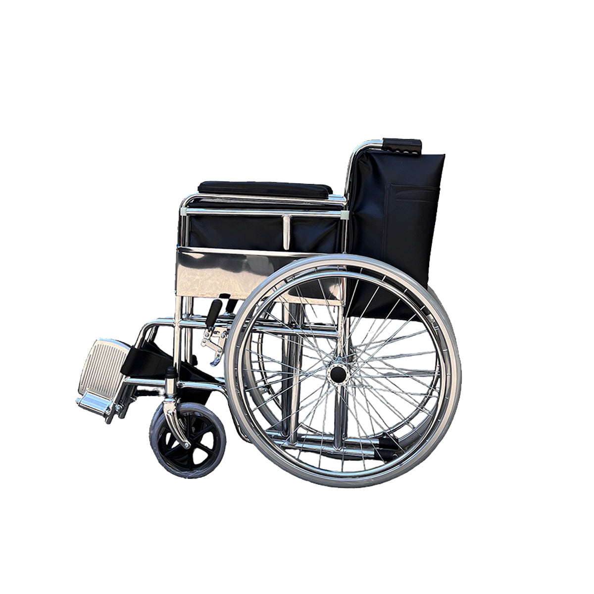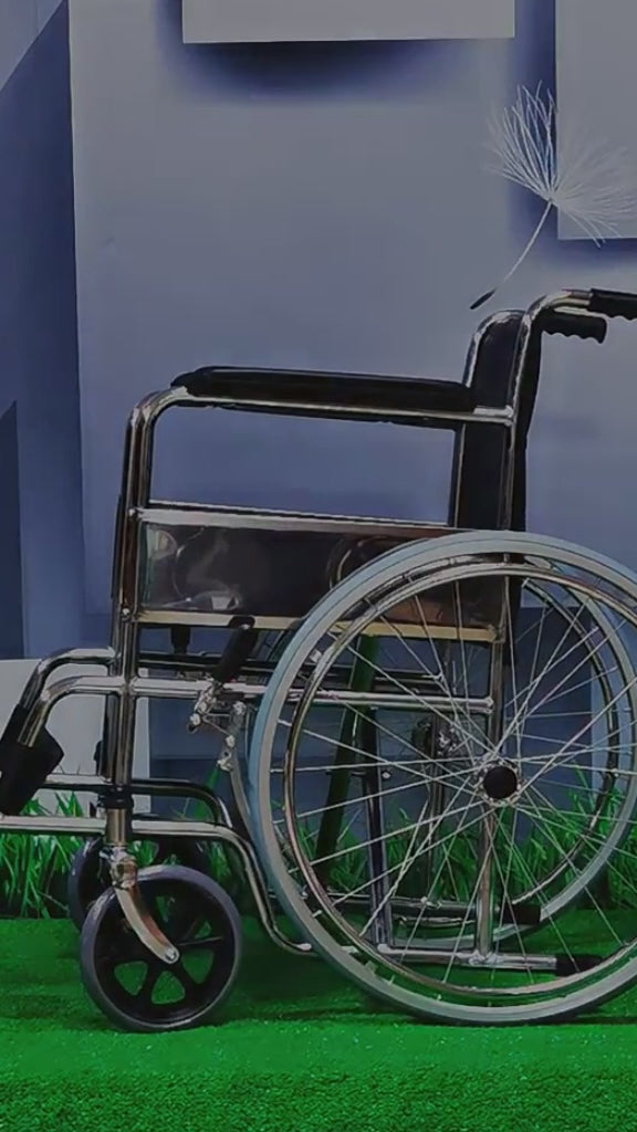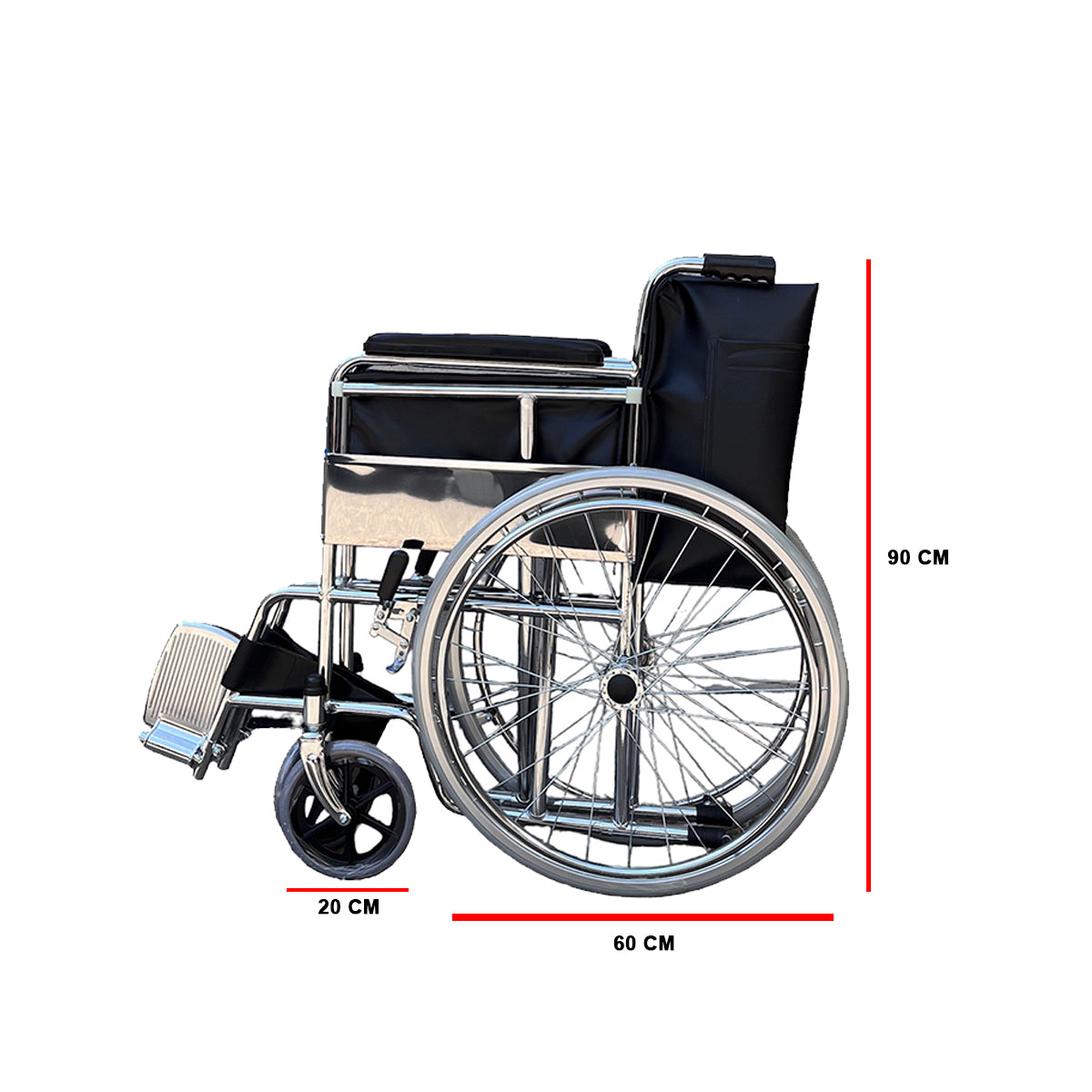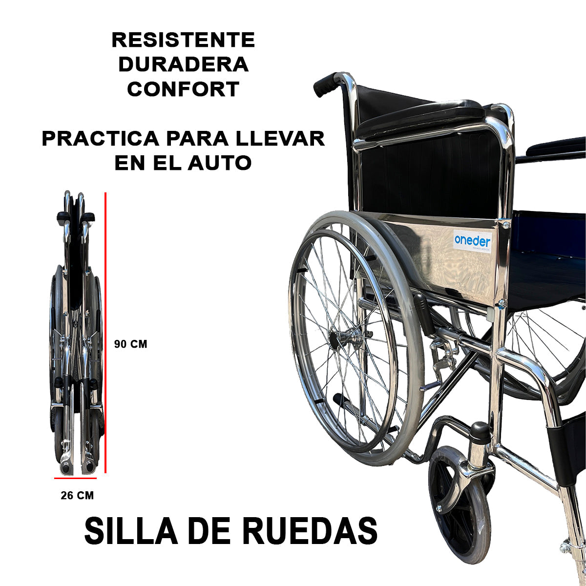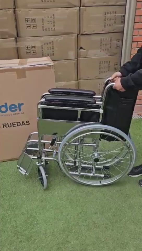 Silla De Ruedas, Ruedas Macizas, Plegable Cromada: Practico equipo medico de movilidad que brinda un excelente confort y seguridad a pacientes con movilidad reducida de tren inferior, producto armado y listo para ser usado, su modalidad de pliegue permite un cómodo almacenamiento y fácil traslado en el maletero de vehículos convencionales